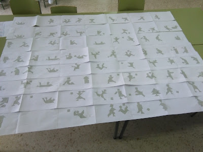En esta semana toda la clase había terminado los planos a escala de la pared con sus correspondientes trangram. Posteriormente hicimos una selección de los que estaban mas completos. tras ello votamos cual de ellos seria el que se representaría en la pared y ganó el cuarto empezando por arriba.